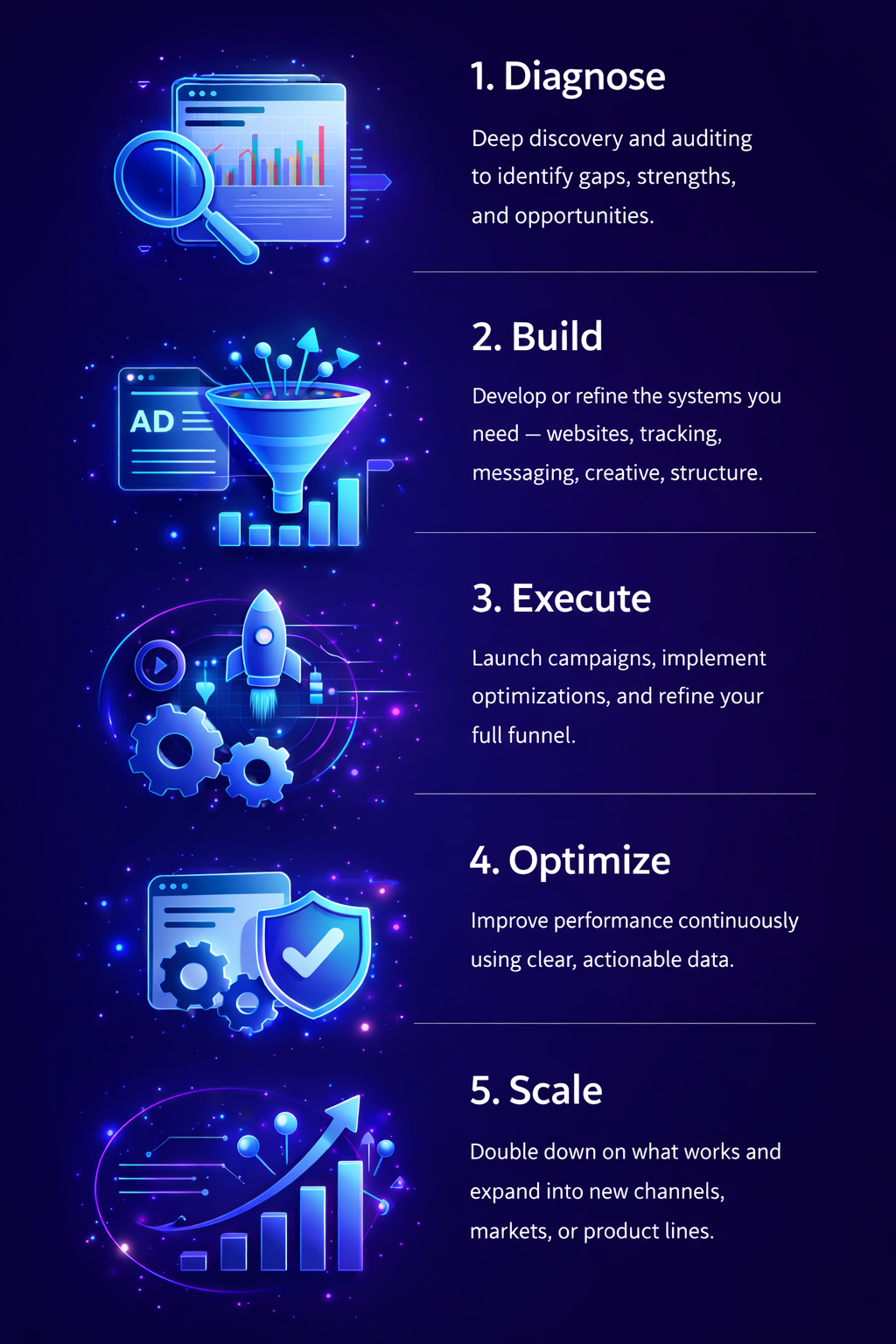 Ya sea que se trate de reconstruir su sitio web, lanzar campañas de alto impacto u optimizar todo su embudo de ventas, nos centramos en lo que importa: rendimiento, claridad y resultados medibles.